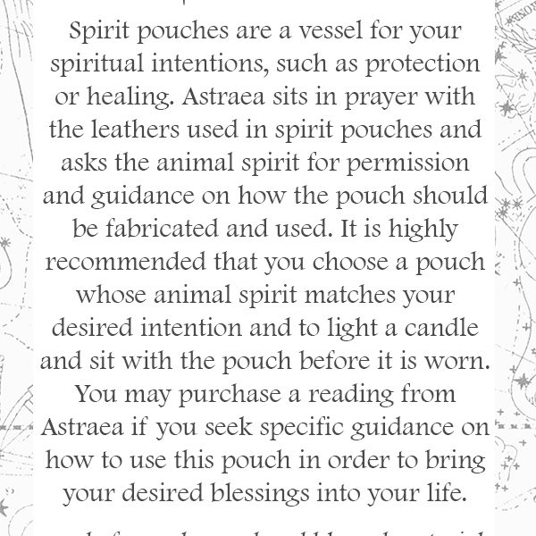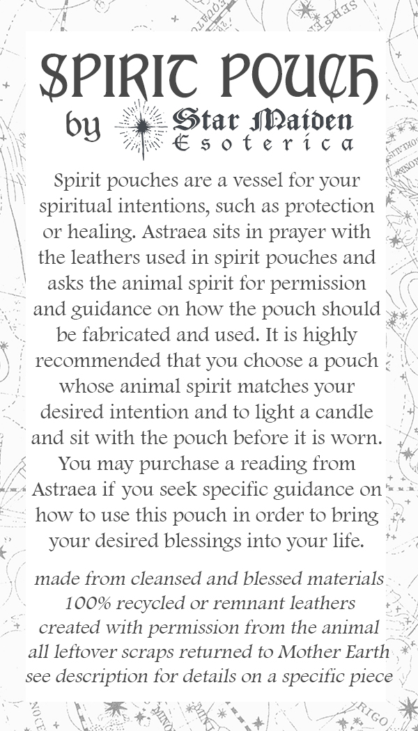 Astraea will make a custom pouch for you by working with your spirits and the animal spirits present with the leathers in her reserve. The design and fabrication will be done according to the vision she receives of the pouch you are meant to own to serve the intent you desire. Spirit pouches are a vessel for your spiritual intentions, such as protection or healing, and can contribute to the intent you have for your spiritual path.